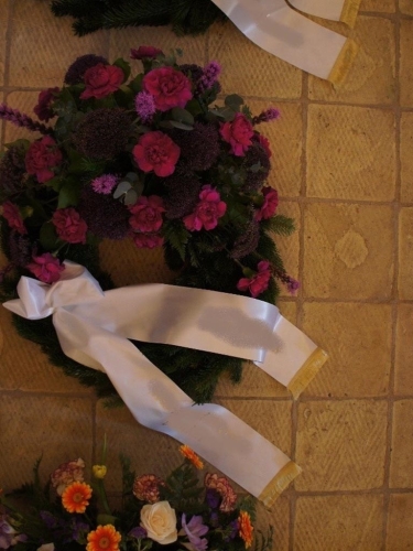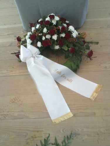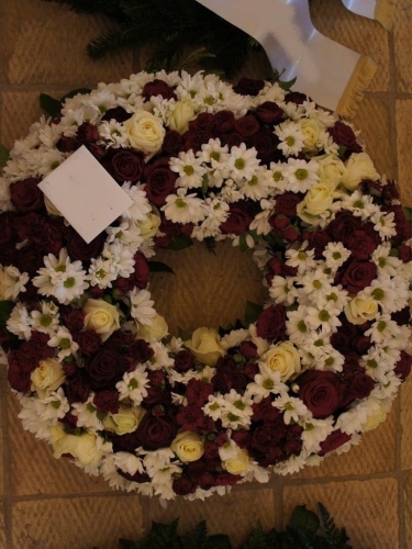 Begravelseskrans med bordeaux roser og hvide blomster