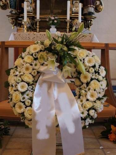 Begravelseskrans med hvide roser og hvide blomster med bånd