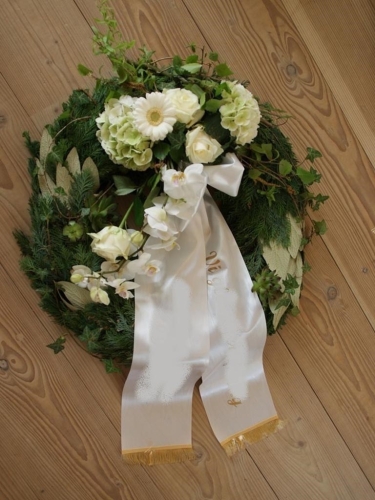 Begravelseskrans med hvide roser og hvide blomster med bånd