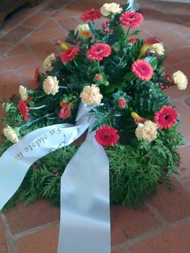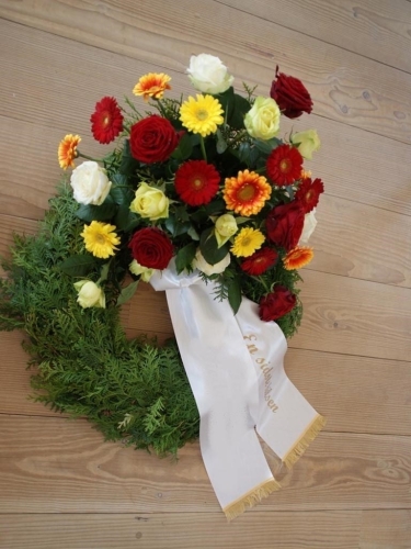 Begravelseskrans med røde og gule blomster med bånd